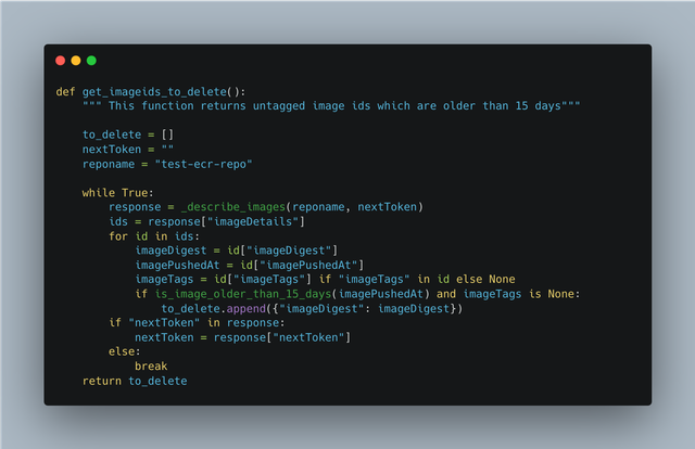 aws ecr batch-delete-image --repository-name test-ecr-repo --image-ids imageTag=test-web-imgRunning a periodic script in lambda